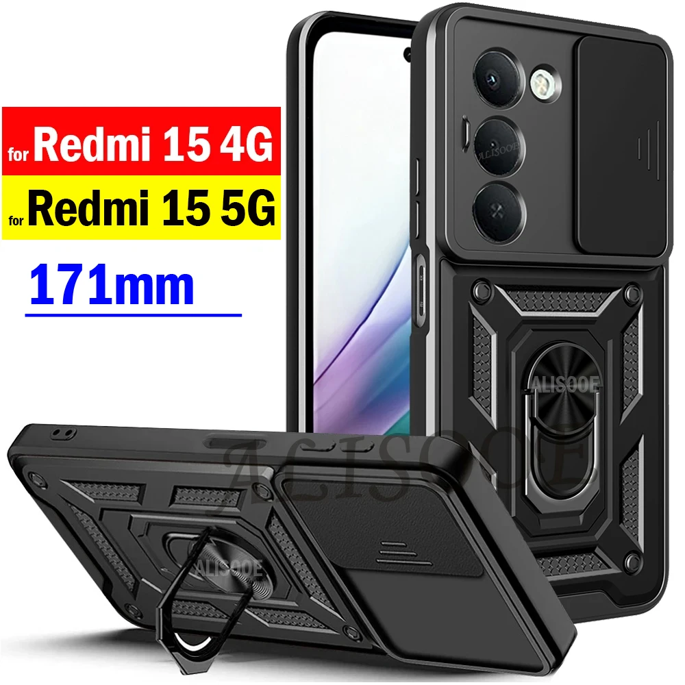 For Redmi 15 171mm Case Slide Camera Armor Ring Holder Kicktand Protection Phone Cover Capa Funda